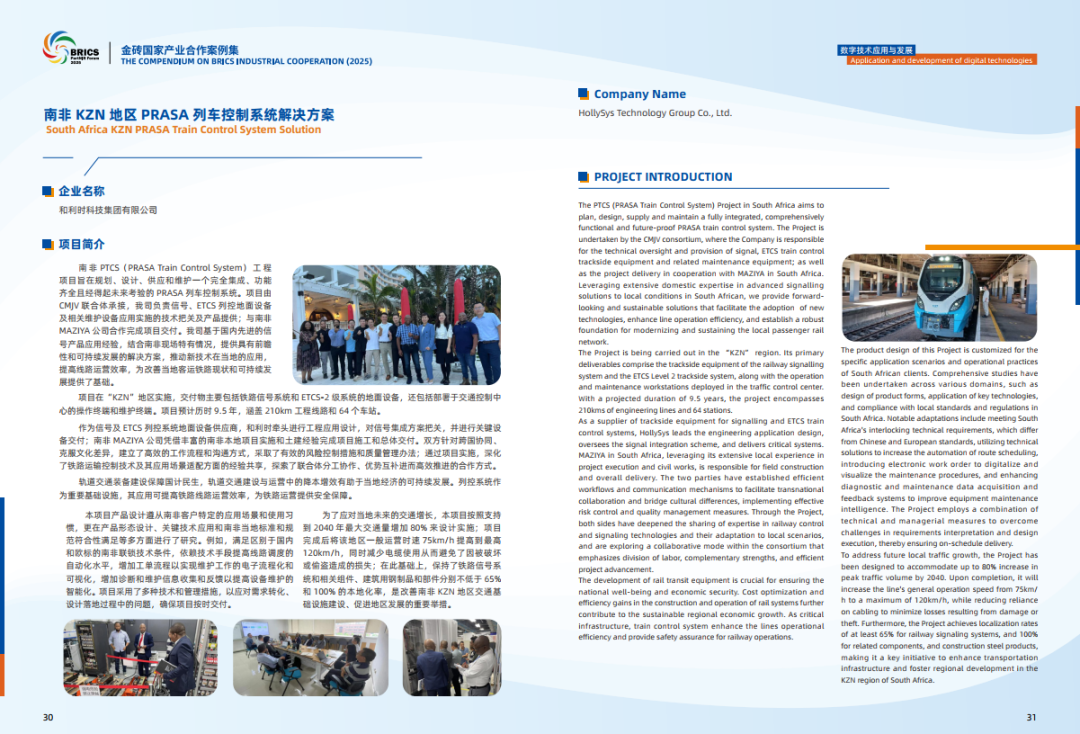 此外,和利时集团申报的《南非KZN地区PRASA列车控制系统解决方案》成功入选《2025金砖国家产业合作案例》。该方案通过自主可控的列控技术,有效提升南非KZN地区铁路通勤效率与安全水平,为当地工业化基础设施升级提供了可靠支撑。