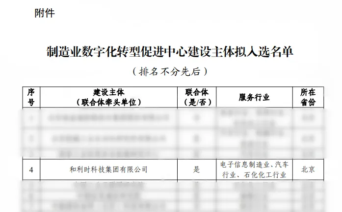 近日,工业和信息化部发布《制造业数字化转型促进中心建设主体拟入选名单》,首批共62家单位入选。由和利时科技集团有限公司牵头,联合北京和利时系统工程有限公司、北京和利时智能技术有限公司、杭州和利时自动化有限公司、中国电子技术标准化研究院组成的联合体位列其中。中心将聚焦电子信息制造、汽车、石化化工三大重点行业,提供全链条、定制化的数字化转型解决方案与服务。此次成功牵头获批,不仅是国家层面对和利时数字化服务能力的权威认可,更彰显了其在制造业数智化领域的行业引领地位。