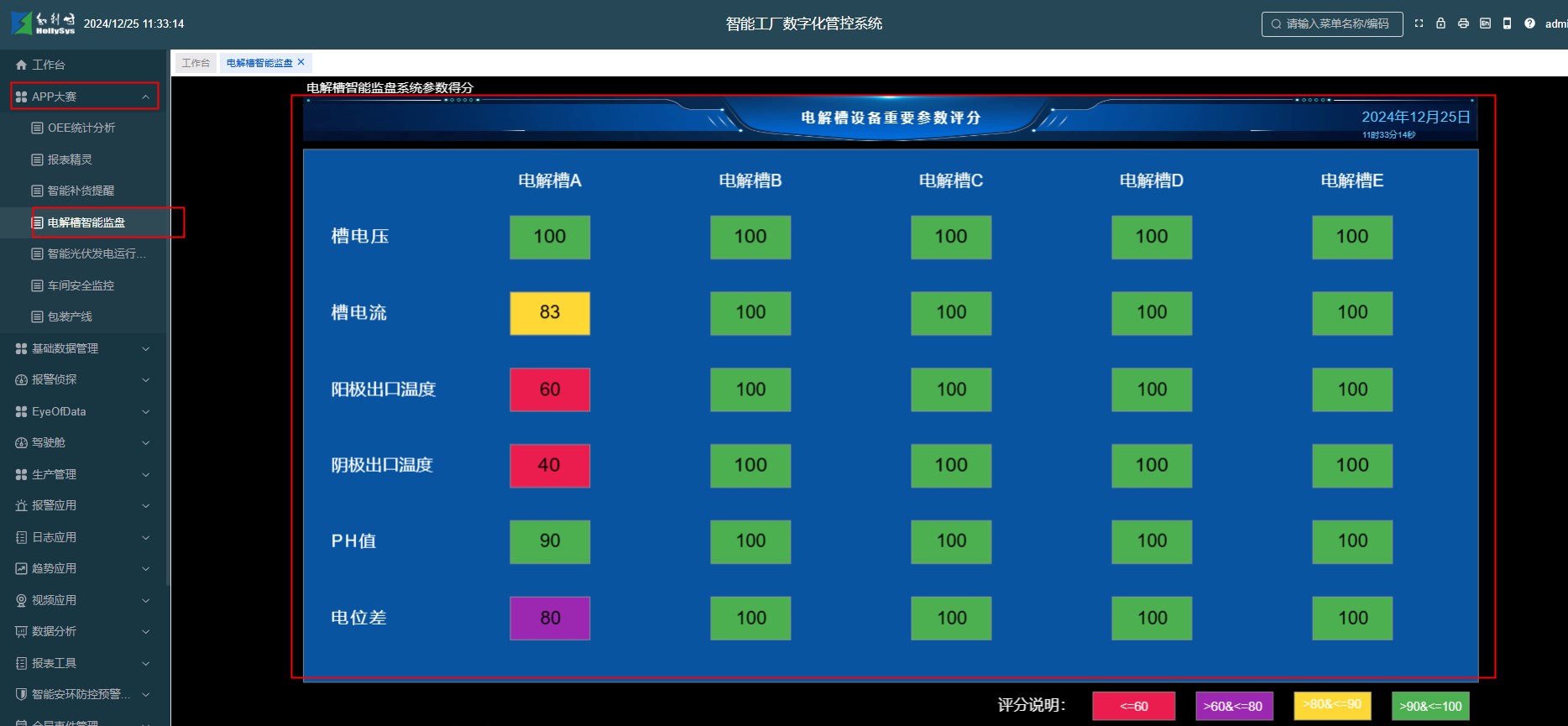 本应用通过获取每个电解槽运行过程中实时的槽电压、槽电流、阳极出口温度、阴极出口温度、PH值、电位差等数据,通过自定义算法,完成电解槽的健康度的计算并打分,这样就可以直观获取每个设备不同指标的实时健康度,及时发现潜在的问题,减少故障发生,提高生产效率,为企业的可持续发展目标提供了有力支持。